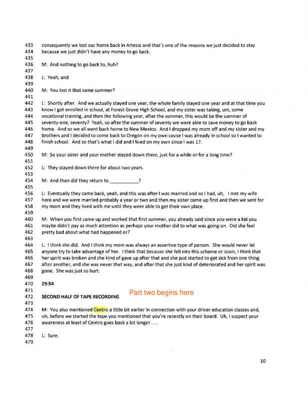 - An audio recording of an oral history of Lorenzo Rubio, including his chilhood in Mexico, moving to North Plains, and life on the Tankersley farms. There is a transcript of this interview.