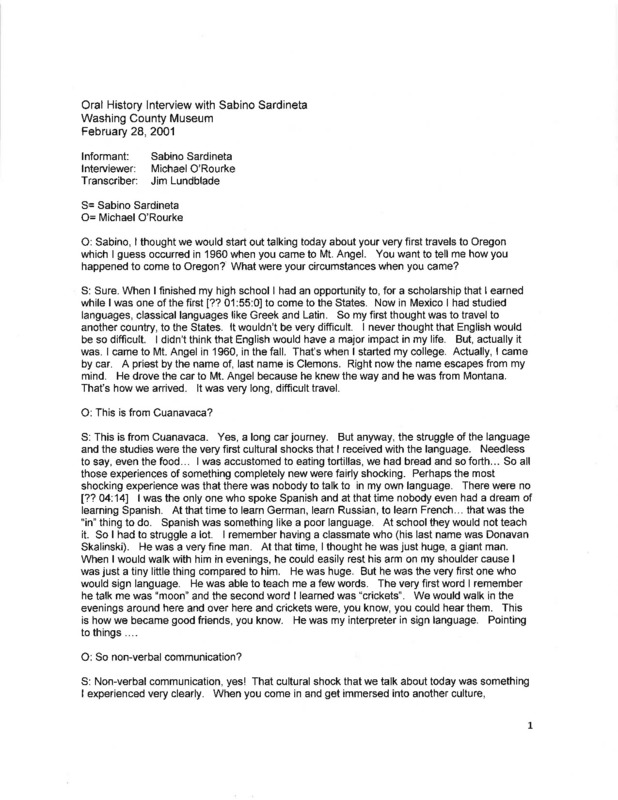 An audio recording of an oral history of Sabino Sardineta, including coming to Mt. Angel seminary as a boy, working as a priest, and a discussion of labor camp conditions in the county. There is a transcript of Part 1 of this interview.