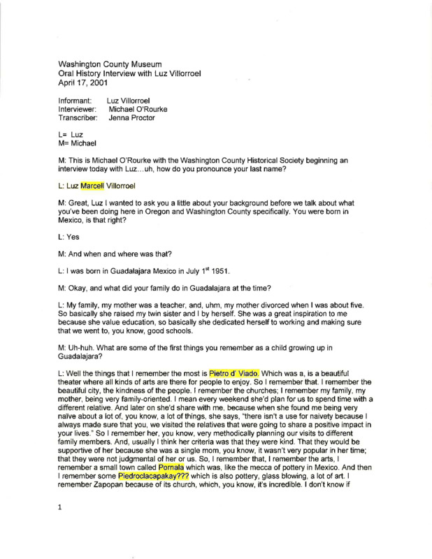 - An audio recording of an oral history of Luz Villaroel, including her work with the Beaverton School District as an ESL Counselor. File includes finding aid. There is a transcript of this interview.