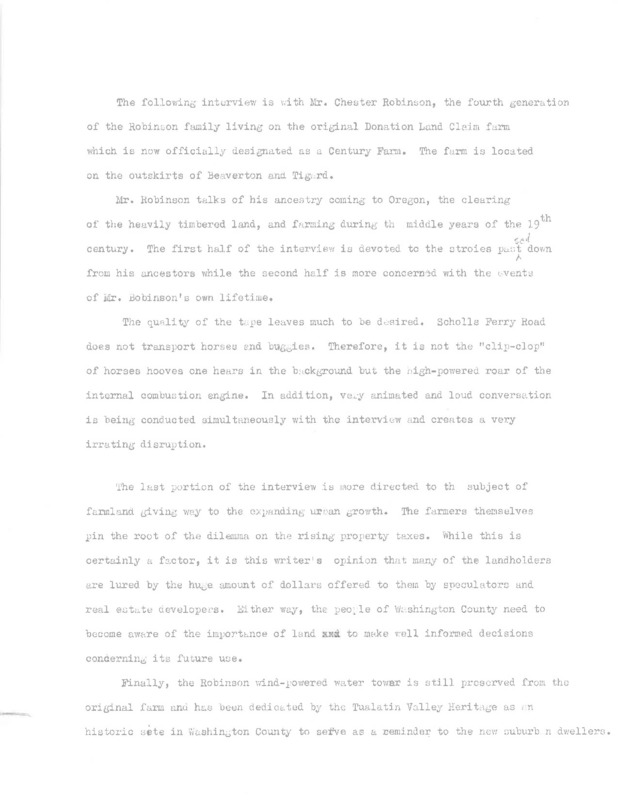 An audio recording of an oral history of Chester Robinson and his family’s history in Washington County, Oregon, during the late nineteenth and early twentieth centuries. He describes the settlement of his great-grandfather on the Donation Land Claim and the original file that was signed by President Andrew Johnson. Talks about the farmland and how it has been used over the years, including its connection to the Milk Wars of 1930 and its business with the Red Rock Dairy. Also talks about politics and the county’s Republican leaning, his life as a teenager on the farm, the passing down of farmland in a family, taxes on farmland, and the historic water tower in the area that was built in 1905. The recording has a lot of background noise including other voices and sounds of automobiles outside. There is a transcript with an introduction and an index, but the transcript ends about halfway through the interview.
