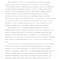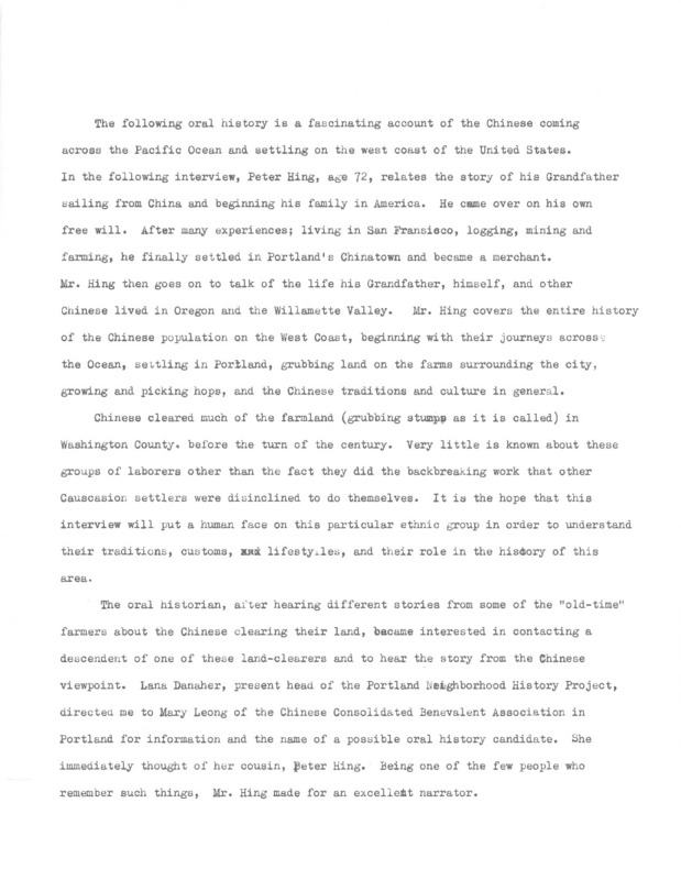 An audio recording of an oral history of Peter Hing recorded on April 18, 1978, on his family’s settlement in the early nineteenth century on the west coast and the history of the Chinese population in Washington County, Oregon. He mentions the Race Riots in Portland, Oregon, religion and the conversion of many Chinese to Christianity, the Opium War, family tongs, and the industries that the Chinese laborers were involved in- farming, grubbing stumps, and mining. Hing describes his personal life going to school in the Tualatin area in a one room schoolhouse, his father purchasing land and the hops business in the area, and the importance placed on Chinese children of his generation to continue their education. Many Chinese who went on to college, Hing included, did not find jobs, immediately or ever, in their field of study because of racial discrimination. Hing compares that to his experience in 1978, the time of the interview, and states that there is no discrimination in the hiring process and it is based strictly on merit. Hing also describes the process of borrowing money that the Chinese had in the early twentieth century with the formation of clubs of ten to twenty families. He finishes with distinguishing between the different generations of the Chinese in America and how that has affected the perception of them both in America and in China. There is a typed page of introduction along with the recording and how Peter Hing was chosen to be interviewed.