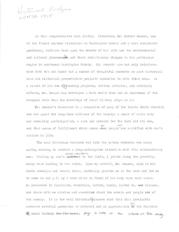 An audio recording of an oral history of Robert Benson on the history of Washington County, including a discussion of his family, the history of Hevetia, Indians in Washington County, and reflections on the importance of local history. There is a transcript of this interview.