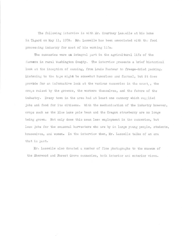 - An audio recording of an oral history of Courtney Lasselle on the canning industry in Washington County. There is a transcript of this interview.