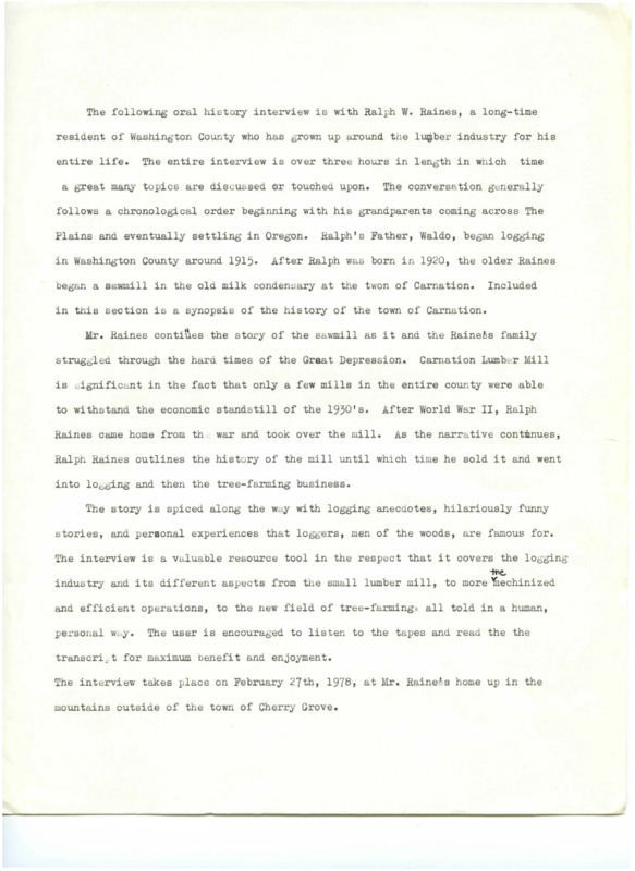 - Ralph Raines oral history recording on logging and tree farming Part 1