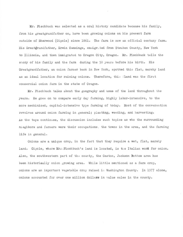 An audio recording with a full transcript of an oral history of Chester Fischbuck on April 25, 1978, about his family’s onion farm near Sherwood, Oregon. He talks of his family’s settlement in the late nineteenth century and his great-grandfather being the first to grow onions in the area. The land before the settlement is described and then the process of growing and farming onions. The onion market was not affected by the Great Depression because of the international trade of onions. He talks of his neighbors and their history and onion farms, the Riperian Water Rights on the Tualatin River, the addition of electricity to the farm as it grew, and the future of the onion farmland. The transcript has a page of introduction to the interview.