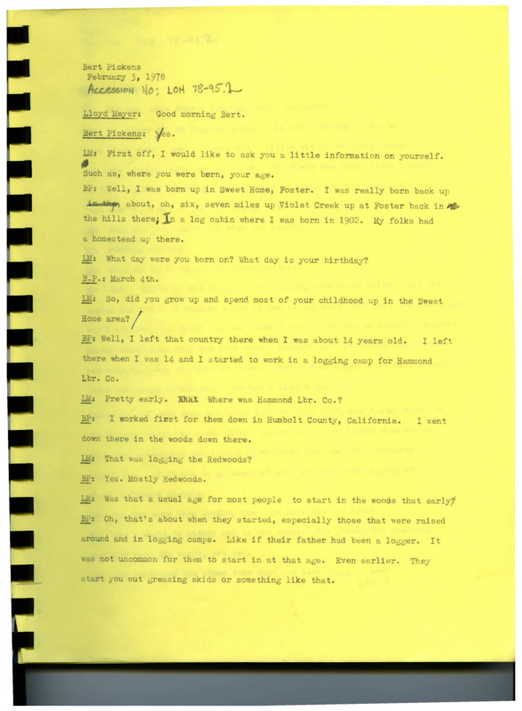 An audio recording and transcript of an oral history of Bert Pickens on February 3, 1978, about the logging industry in Washington County, Oregon, during the beginning of the twentieth century. The recording starts with a quick overview of what was discussed: logging equipment, changes in logging methods, life in the logging camps, the IWW (International Woodworkers of the World) union, and past friendships. The interview starts at 0:34 and at about 4:00, it becomes harder to hear Bert Pickens. He also talks of wages, the effects of the Great Depression and the wars on logging, and the Four L (Loyal Legion of Loggers and Lumbermen) company union.