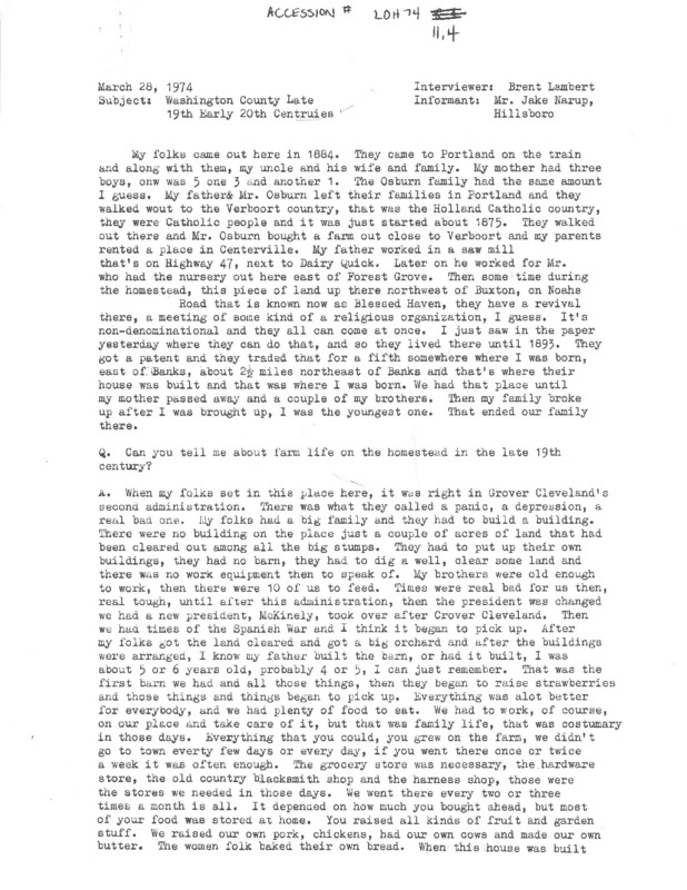 An audio recording of an oral history of Jake Narup of Hillsboro, Oregon, in 1974 about the end of the nineteenth century and the early twentieth century. He describes life on a farm in Washington County during the time of the Henry Ford automobile craze, railroads being laid, and the strikes throughout the Portland metropolitan area over milk in the 1930s. Logging is discussed including wages, animal usage, and the affect the wars had on the business. At 32:15, there is an interruption in the recording and the interview date changes from March 28, 1974, to April 19, 1974. A second interruption in the recording at 48:45, topic changes to logging camp life, the starting of unions and their contributions, some logging companies in Washington County, and the Tillamook Burn. There is a partial transcript of the recording with it.