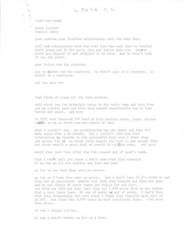 Charles Imlay oral history recording on Ladd-Reed farm. The Imlay family handled a lot of the Ladd-Reed farm’s grain in the earlier years; storing it, cleaning it and then shipping it to town to be sold. The farm itself produced mainly wheat in the earlier years, but later expanded to producing oats, hay and livestock. Besides this farm Reed also had a farm in the valley that was about 3000 acres. At one point both men believe that Reed owned as many as 14 farms at once. The house on the farmland was run by the foreman; having eight to six rooms and a large kitchen that could fit as many as 40 men at once for a meal. Besides the house there were three different barns for the horses, hogs and cows and a creamery. By 1895 all the livestock had been sold or moved from this main farm to a different, besides the ones used for the creamery. Despite owning the land and farm Charles never recalls seeing Mr. Reed on the farm.