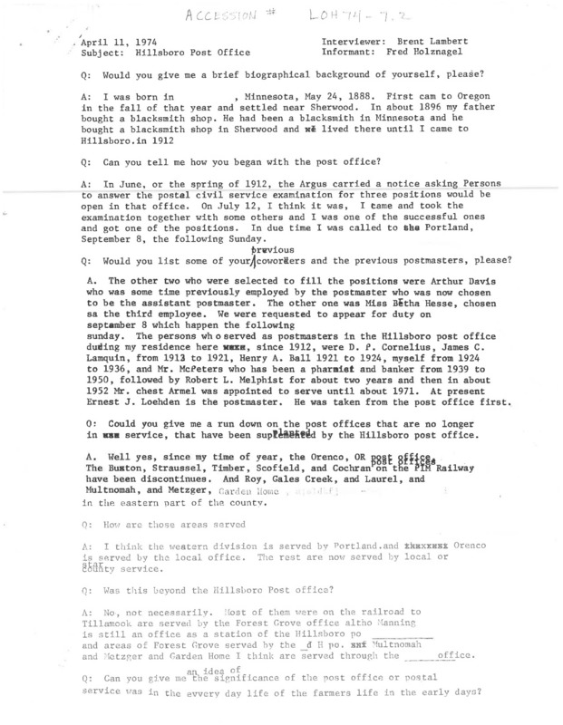 - An audio recording of an oral history of Fred Holznagel on the Hillsboro post office. There is a transcript of this interview.