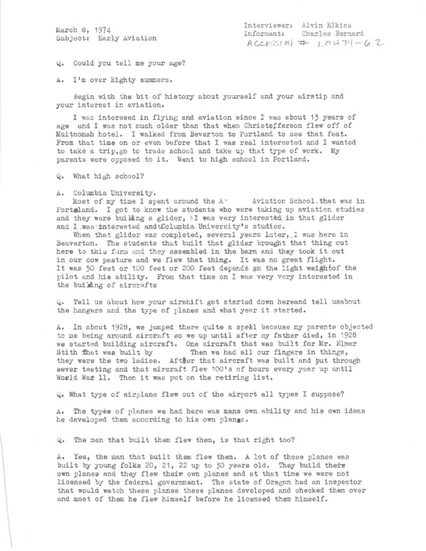 Charles Bernard oral history recording on early aviation