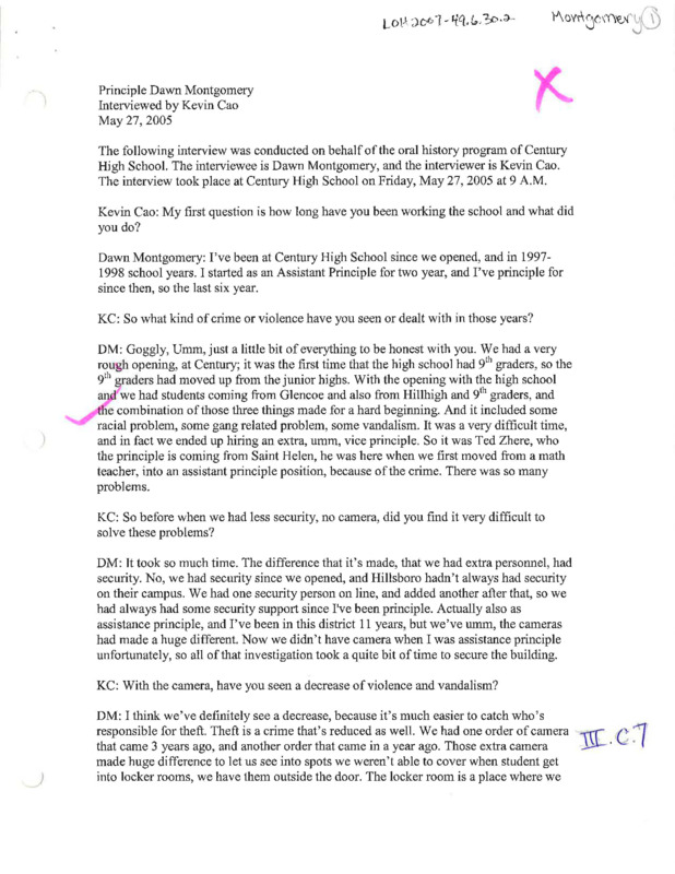 - An audio recording of an oral history of Dawn Montgomery, Principal of Century High School, on trends in crime and law enforcement in Hillsboro, Oregon from 1980-2005. There is a transcript of this interview.