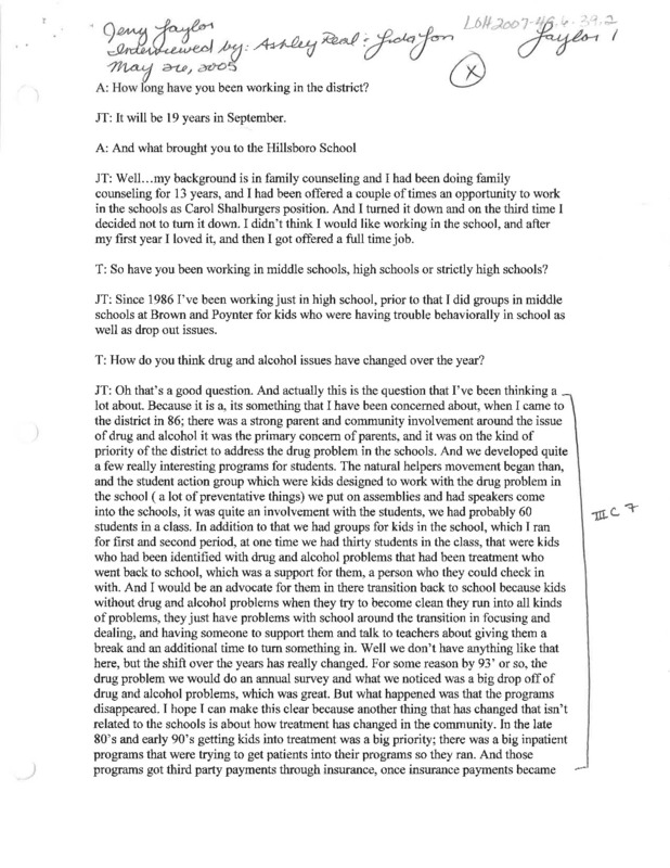 - An audio recording of an oral history of Jerry Taylor, Century High School Counselor, on trends in crime and law enforcement in Hillsboro, Oregon from 1980-2005. There is a transcript of this interview.