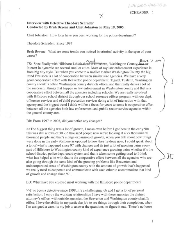 An audio recording of an oral history of Detective Theodore Schrader of the Hillsboro Police Department, on trends in crime and law enforcement in Hillsboro, Oregon from 1980-2005. There is a transcript of this interview.