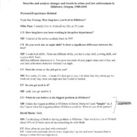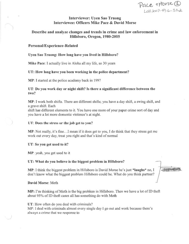 An audio recording of an oral history of Mike Pace, Reserve Police Officer, and David Morse, Sheriff's Office Deputy, on trends in crime and law enforcement in Hillsboro, Oregon from 1980-2005. There is a transcript of this interview.