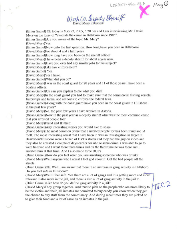 - An audio recording of an oral history of David Mery, Washington County Deputy Sheriff, on trends in crime and law enforcement in Hillsboro, Oregon from 1980-2005. There is a transcript of this interview.