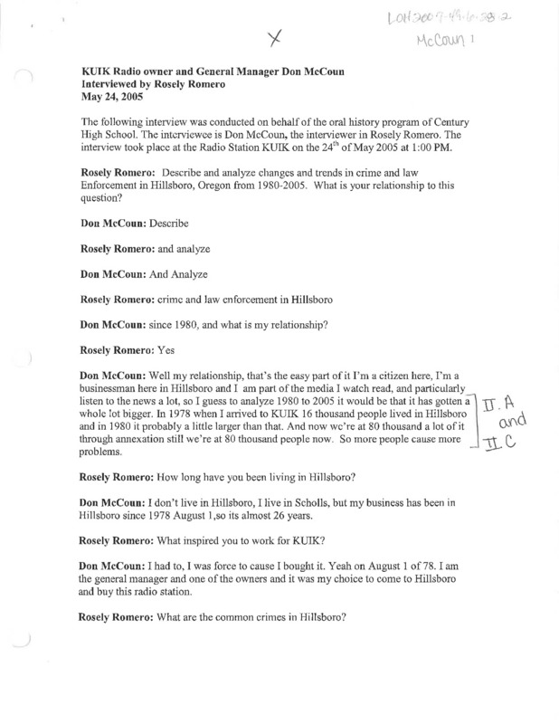 - An audio recording of an oral history of Don McCoun, KUIK Radio owner and General Manager on trends in crime and law enforcement in Hillsboro, Oregon from 1980-2005. There is a transcript of this interview.