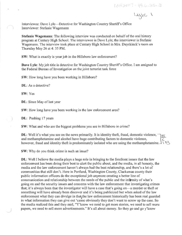 - An audio recording of an oral history of Detective Dave Lyle of the Washington County Sheriff's Office on trends in crime and law enforcement in Hillsboro, Oregon from 1980-2005. There is a transcript of this interview.