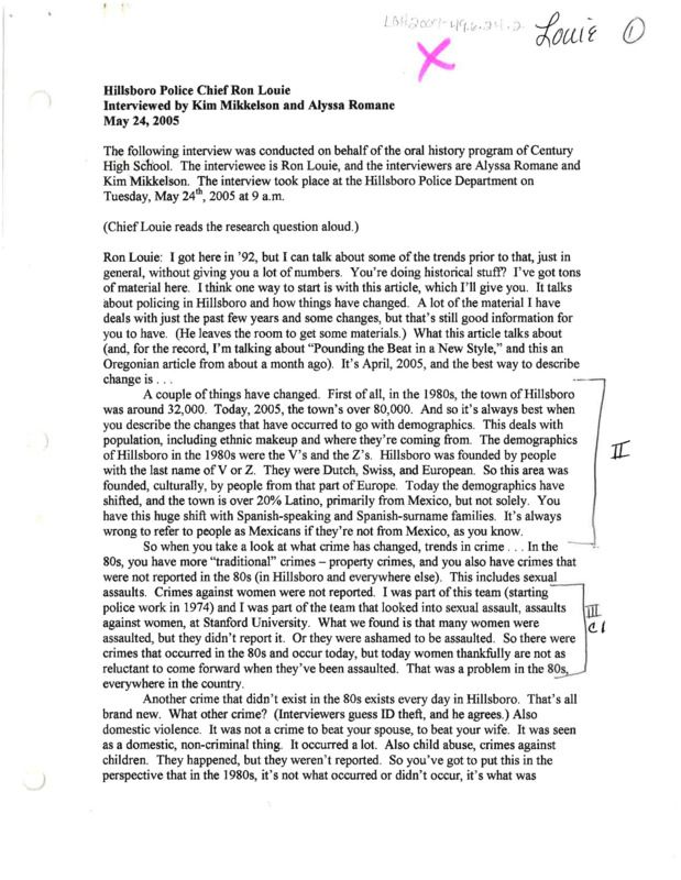 - An audio recording of an oral history of Police Chief Ron Louie on trends in crime and law enforcement in Hillsboro, Oregon from 1980-2005. There is a transcript of this interview.
