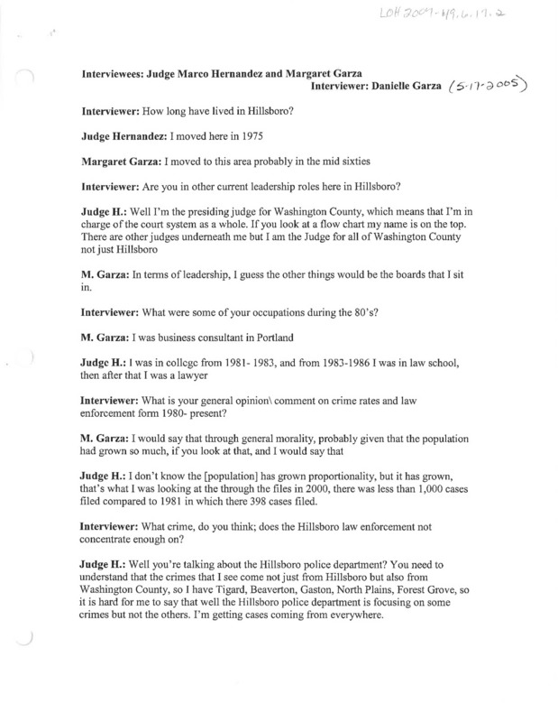An audio recording of an oral history of Judge Marco Hernandez and Margaret Garza, Senior Management Analyst for Assessment and Taxation in Washington County, on trends in crime and law enforcement in Hillsboro, Oregon from 1980-2005. Audio quality is poor; speakers are difficult to hear. There is a transcript of this interview.