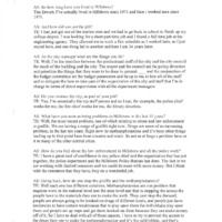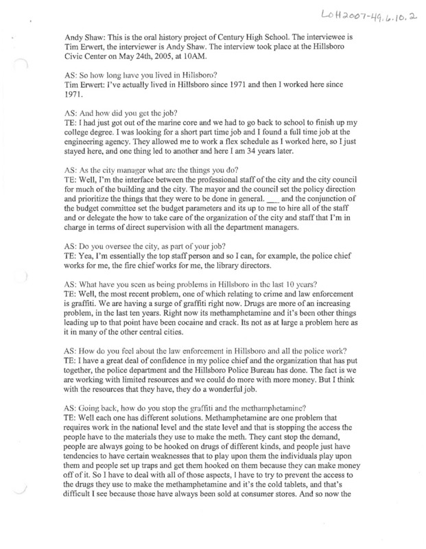 An audio recording of an oral history of Tim Erwert, City Manager, on trends in crime and law enforcement in Hillsboro, Oregon from 1980-2005. The audio recording is poor quality and it is difficult to hear Erwert. There is a transcript of this interview.