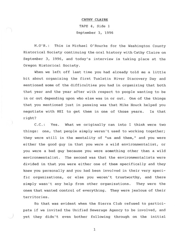 - An audio recording of an oral history of Cathy Claire. There is a transcript of this interview.