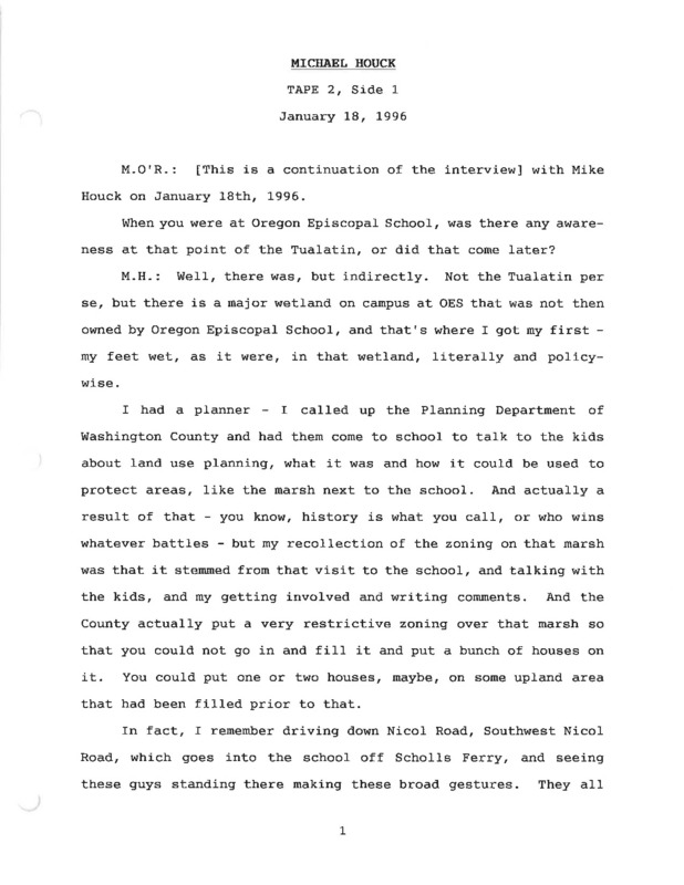- An audio recording of an oral history of Mike Houck. There is a transcript of this interview.