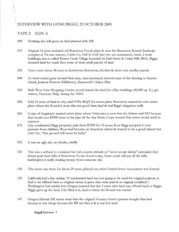 - An audio recording of an oral history of Gene Biggi on Beaverton Foods. There is an index of this interview.
