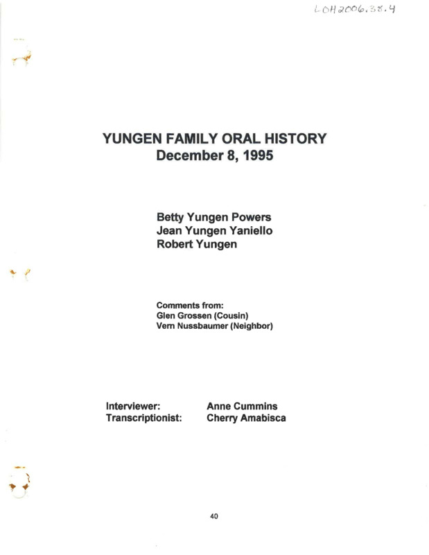 - An audio recording of an oral history of siblings Robert Yungen, Betty Powers, and Jean Yonello. There is a transcript of this interview.