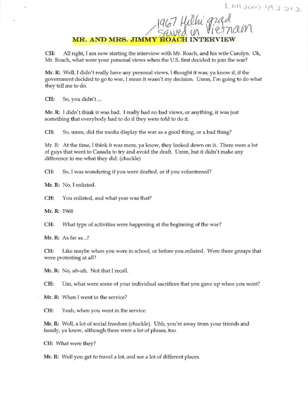 An audio recording of an oral history of Jimmy and Carolyn Roach on the Vietnam War. Jimmy Roach and Carolyn Roach both attended Hillsboro high school. Mr. Roach graduated in 1967 and he enlisted in service in 1968. He was in the 25th Infantry, mechanized unit in Vietnam, where he was wounded during his second day in the field. As a result he was transferred to a medical camp team where he provided security. He received the Purple Heart and Bronze Star and spent the remaining 8 months of duty in Italy. The two recall people showed that they supported the war by wearing MIA bracelets.