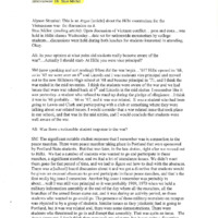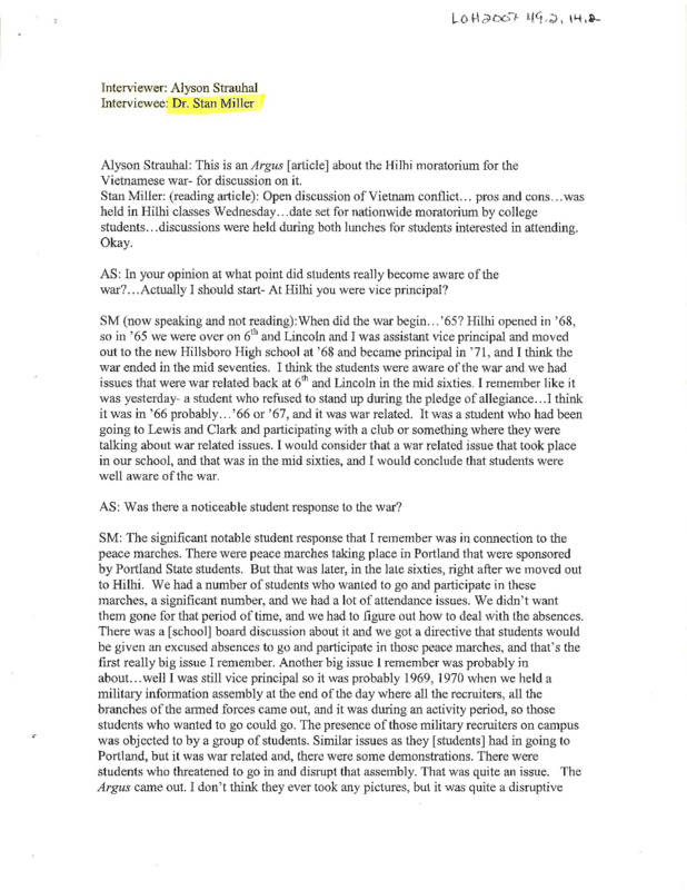 An audio recording of an oral history of Dr. Stan Miller. Not dated, but based on other cassettes stored with it, year is likely 2001. The interview begins with Dr. Miller quoting an article from the Argus newspaper on discussion of the Vietnam Conflict at Hillsboro High School. In 1965 Dr. Miller was the Assistant Principal at the school, and in 1971 he became Principal. Dr. Miller recalls a topic of conversation among students at Hillsboro high school was a student attending Lewis & Clark high school that refused to stand for the pledge of allegiance. There was a period of change for students as society was evolving: the women