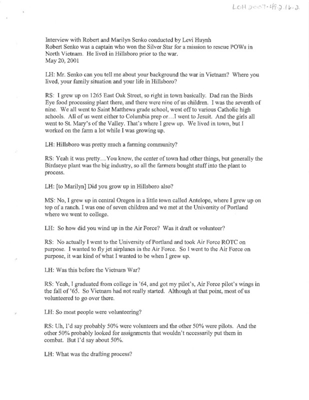 An audio recording of an oral history of Robert and Marilyn Senko on the Vietnam War. Robert Senko grew up in Hillsboro and his father ran the Birds Eye food processing plant. He attended Jesuit High School and the University of Portland. Marilyn grew up in Antelope, OR, and met Robert while attending the University of Portland. While attending University of Portland, Mr. Senko took Air Force ROTC and received his Air Force pilot license.