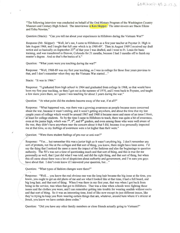 An audio recording of an oral history of Ken Skipper on Hillsboro during the Vietnam War. Ken Skipper came to Hillsboro in 1968 as a first year teacher at Poynter Jr. High. In 1969, Mr. Skipper was drafted and did basic training at Fort Lewis. Later he was transferred to Denver, Colorado to finish his master’s degree and became an occupational therapist for the army at a psychiatric hospital in Denver. Later he went on to work in counseling people with mental disorders and drug issues. Skipper describes how he returned to Hillsboro in the early 1970s as a counselor at Poynter Junior High, then transferred to Hillsboro High School where he taught for a long time.