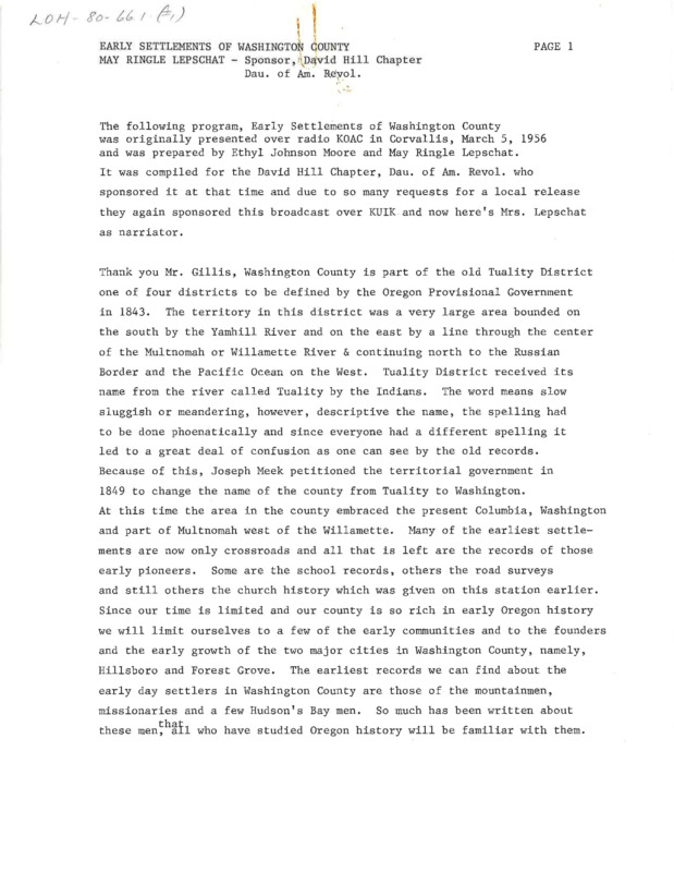 An audio recording of a talk by May Ringle Lepschat on the early settlements of Washington County. The talk was sponsored by the David Hill Chapter of the Daughters of the American Revolution. The program was originally presented over radio KOAC in Corvallis, March 5, 1956. This recording includes a transcript.