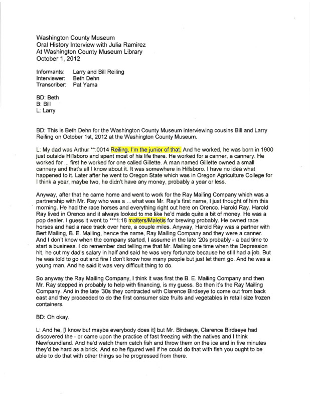 - An audio recording of an oral history of cousins Bill and Larry Reiling on Hillsboro and Birds Eye Cannery. There is a transcript of this interview.