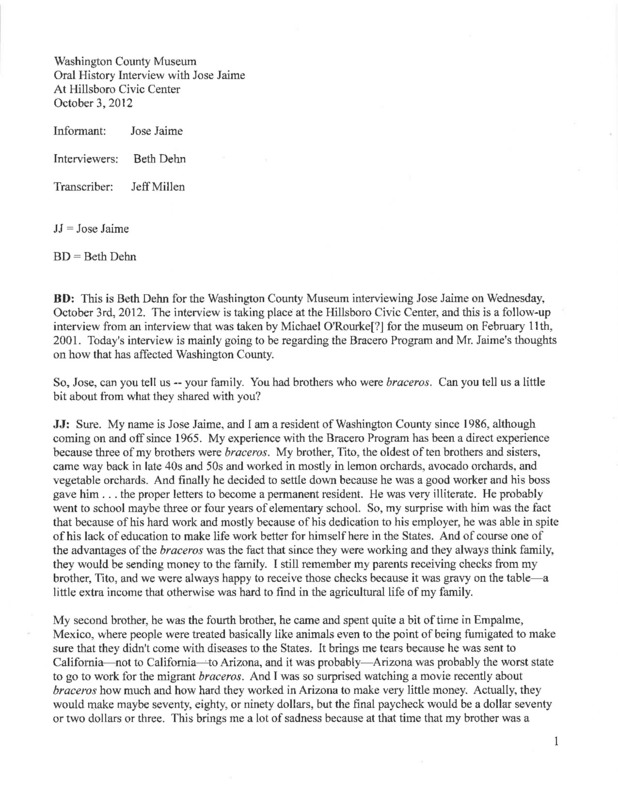 An audio recording of an oral history of Jose Jaime regarding Latino migrant laborers and the Bracero program in the 1940s-1960s. Topics include: his oldest brother's work as a bracero in California beginning in the late 1940s; another brother's work as a bracero in Arizona; hearing about work in America while living in Mexico; reasons for leaving Mexico; meaning of the word 'bracero'; Jose's arrival in Washington County, Oregon in 1965; migrant laborers being hired by Tektronix; several churches subsidizing 12 families so that they could settle permanently in the county; abuses of migrant laborers; how the Hispanic community enriches the county. This recording is accompanied by a transcript.