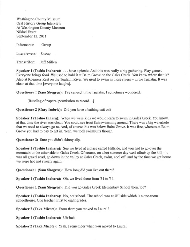 An audio recording of a group oral history interview on the Japanese Community in Washington County at a Nikkei event at the Washington County Museum. There is a transcript of this interview.