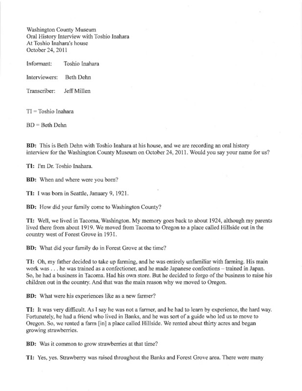 Part 2 of an audio recording of an oral history of Dr. Toshio Inahara, speaking about his experience as a Japanese American in Washington County, Oregon. Topics in this section include: birth in 1921 in Tacoma, WA; moving to Hillside near Forest Grove, OR in 1931; his father learning to farm and raising strawberries; education in a one-room schoolhouse; playing baseball; going to the Japanese School in Banks on Sundays; driving a truck beginning at age 10; moving to other farm properties near Hillsboro and Helvetia; building a house near Hillsboro in 1941; hearing about Pearl Harbor and facing discrimination and restrictions; getting a special permit for his family to spend the war farming in Eastern Oregon, avoiding detention at Minidoka internment camp; moving to Vale, Oregon; renting a former chicken hatchery as a house; losing most of their land in Washington County; leasing their house to a white family during the war; going to college to become a doctor; the postwar Japanese community; and other topics. There is a transcript of this interview.