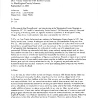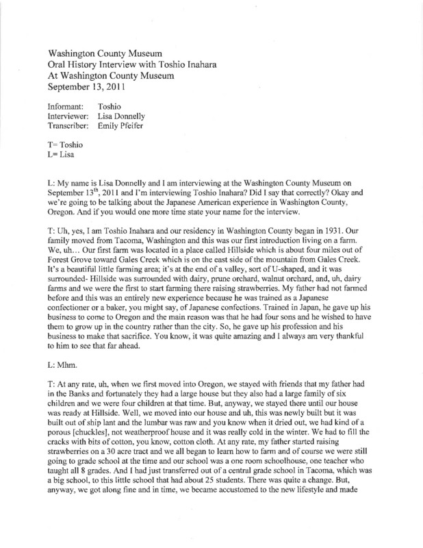 Part 1 of an audio recording of an oral history of Dr. Toshio Inahara, speaking about his experience as a Japanese American in Washington County during World War II. This is a brief introductory interview that was conducted in order to prepare for the longer interview in Part 2. Topics in this section include: moving to a strawberry farm Hillside, Oregon, near Gales Creek and Forest Grove in the 1930s; driving at age 10; going to school in Hillside, Forest Grove High School and Hillsboro High School; moving to other farms near Hillsboro and Helvetia; obtaining a special permit in 1942 to allow the family to continue farming and not go to an internment camp; picking hops and doing other labor to make ends meet; hearing about Pearl Harbor; and white neighbors who leased one of their properties during the war. There is a transcript of this interview.