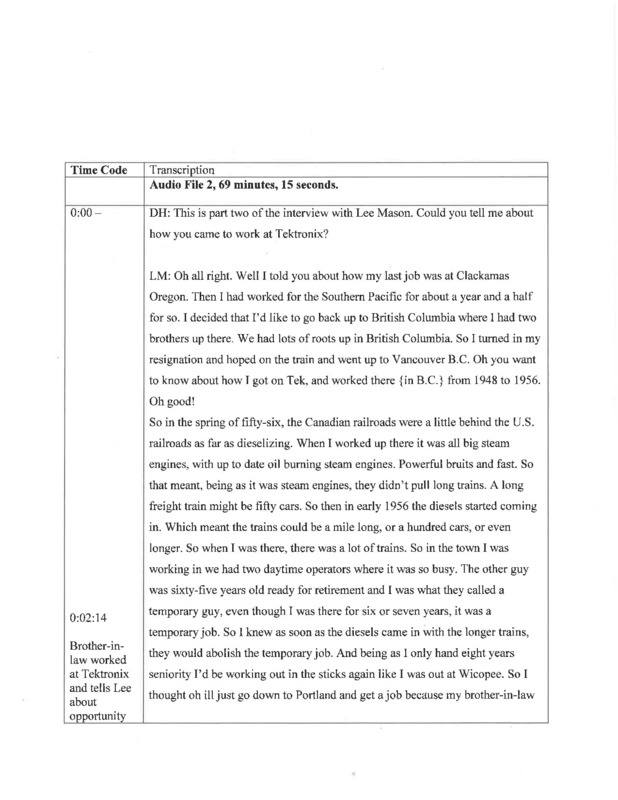 Part 2 of an audio recording of an oral history of Lee Mason on the Silicon Forest and Tektronix. Topics in this section include: resigning from the Southern Pacific Railroad; returning to Oregon in 1956 and applying for work at Tektronix; being hired to work on the production line; doing shift work with sheet metal and injection molding; manufacturing processes; working in the plastic pre-production unit; plastics plant in the early 1980s; creating his own small plastics company; retirement around 1984; other spinoff plastics companies; how production rates were set; racial and ethnic diversity of the production staff; and other topics. There is a transcript of this interview.
