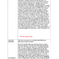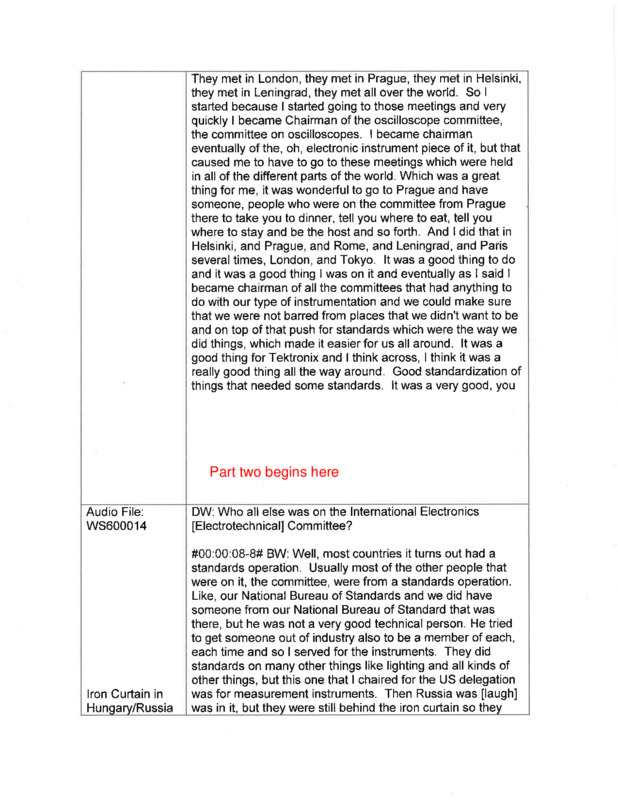 Part 2 of an audio recording of an oral history of Bill Walker on the Silicon Forest and Tektronix. Topics in this section include: Tektronix's international business and the International Electrotechnical Committee (IEC); the effect of the early 1980s Recession on Tektronix; profit sharing with employees; the development of the 'Silicon Forest' in Washington County; the founding of Electro Scientific Industries (ESI); annual shareholder meetings; his children's careers; stories about how Tektronix was founded; other key people in Tektronix's history; and other topics. There is a transcript of this interview.
