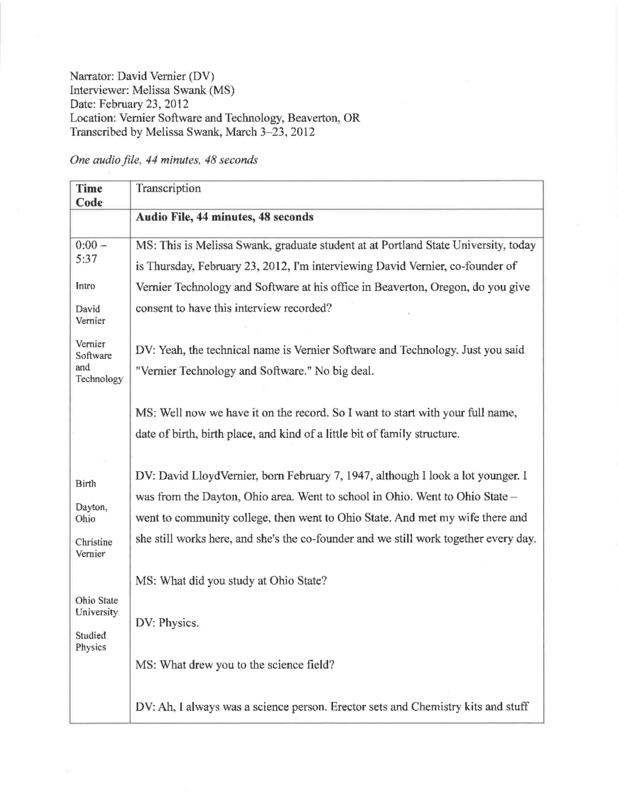 - An audio recording of an oral history of David Vernier on the Silicon Forest and Vernier Systems. There is a transcript of this interview.