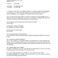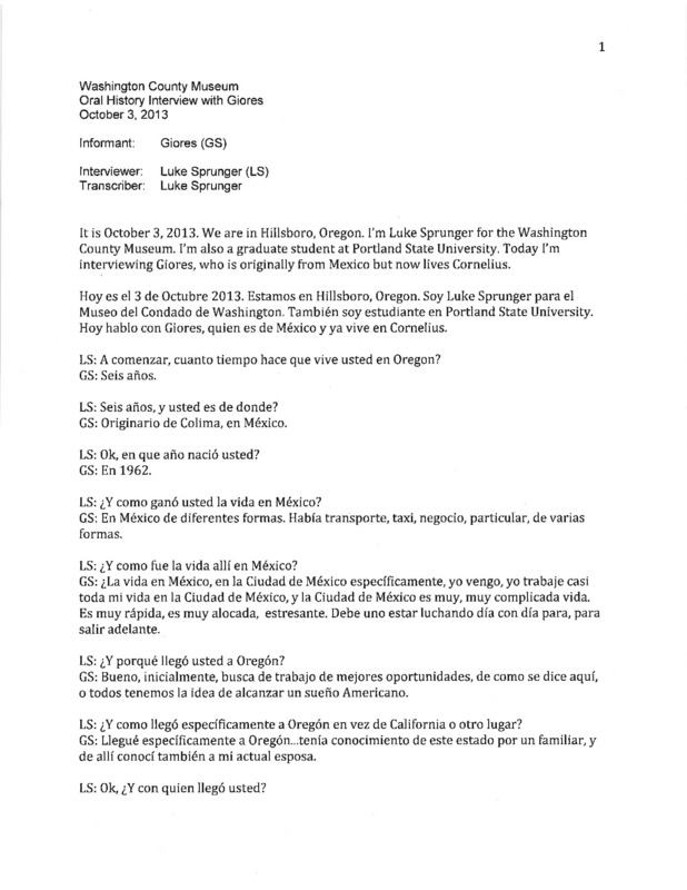 Giores talks about the reasons why he left Mexico and the pull of the “American dream” that prompted him to relocate. He speaks about the difficulty of the border crossing. The experience inspired him to write a short piece about the border crossing of an individual named Juan. An excerpt from that piece is included at the end of this transcript, shared with the permission of the narrator. Giores elaborates on the process of adjusting to life in Washington County. He explains his relationship with Mexican culture, the country of Mexico, and the ways that he remains in contact with family members there. He also offers his opinions on English-speaking U.S. culture and society. Though work in the United States has not been easy, Giores has overall felt well treated in Washington County and recalls the support of volunteer English teachers and the appreciation that bosses and clients have demonstrated for his work accomplishments. Interview is in Spanish. There is a transcript of this interview.