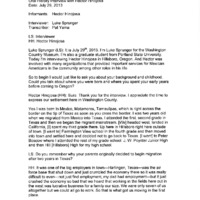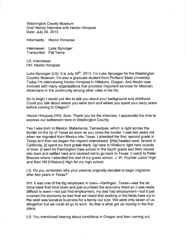 An audio recording of an oral history of Hector Hinojosa. He was born in Matamoros, Tamaulipas, Mexico, and migrated to Harlingen, Texas with his family when he was two years old. After Harlingen experienced an economic downturn, the family began migrating seasonally across the country for agricultural work and eventually settled in Washington County. In spite of his abilities, Hector found himself struggling in high school due to a strict policy that penalized him for absences he took to help his family. Hector dropped out during his sophomore year and worked full-time managing a co-op gas station to help support his parents. After a year he was able to return to school through Job Corps in Portland and obtain his GED. Upon graduation Job Corps offered Hector part-time work as a counselor and gave him a scholarship to attend Portland State University to study guidance and counseling. Once he completed the program, Hector worked as a counselor at Forest Grove high school, and after several years began work with a program at University of Oregon to help struggling high school students obtain GEDs. Hector then spent a year working as a recruiter for Colegio César Chávez, and then moved to California to work for Castle & Cooke and negotiate labor contracts between the company and union leaders such as César Chávez. Hector eventually returned to Washington County. He resides in Hillsboro and continues to do independent consulting work for businesses. During his years in Washington County Hector has also been involved with a number of social service organizations.