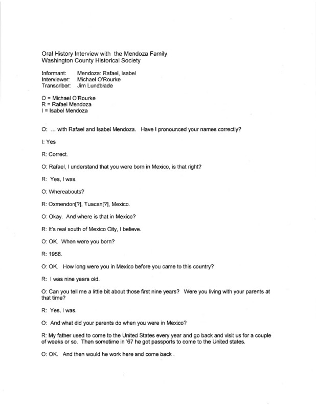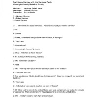 Part 1 of an audio recording of an oral history of Isabelle and Raphael Mendoza. Recording sounds a bit distorted. Rafael was born in Michoacan, Mexico in 1958 and shares memories of poverty during his childhood. He describes his father coming and going between US and Mexico to do farm/field work. Rafael's first arrival to the U.S was to Stockton, CA where he then migrated to North Plains, OR to work at Jerry Stenker's camp. He shares his devastation in not finishing school to focus on work. Rafael met his wife, Isabel, in 1977. He shares how he and Isabel started their own business. Isabel was born in Wyoming in 1957. Her parents separated and they moved to Mora, New Mexico in 1962 with her mother's family. She shares fond memories of helping out with her family business as a child, as well as helping clean homes for people. She moved to Oregon in 1975. At minutes 29:49 she talks about the SETA program that helped her family find a job, which cemented their stay in Oregon. She describes her experience working at a mink farm as well as her experiences working at Washington County Community Action. Isabel shares how she and Rafael met, cultural differences between the two, and they both go into further detail starting their business in 1982 - which included constant travel to and from California. There is a transcript of Part 1.