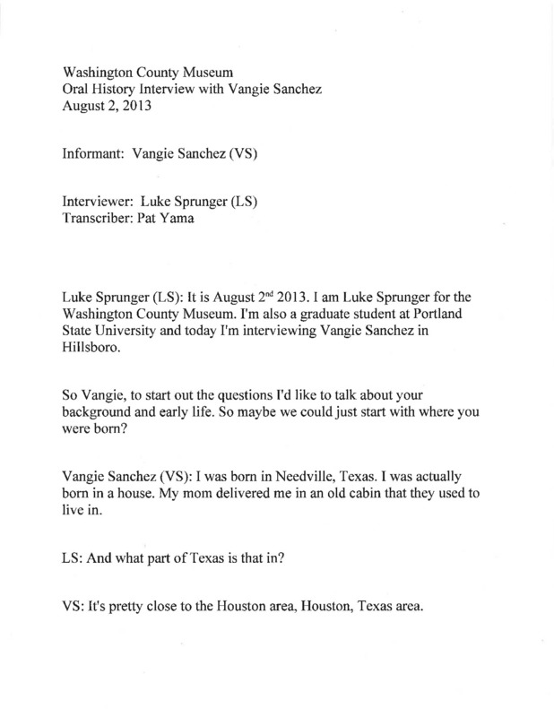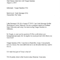 An audio recording of an oral history of Vangie Sanchez. Evangelina Sanchez was born in Needville, Texas. She finished high school in Texas, and at age 19 joined the migrant stream with her mother, stepfather, siblings, and two children. After living and working seasonally in Colorado and California (where they were introduced to the labor activism of César Chávez and the United Farm Workers), Vangie and her family settled in Washington County in 1967. She eventually left field work to become a home school counselor for Migrant Education, and went on to work for such other social service organizations as Valley Migrant League, Virginia Garcia Clinic, and Legal Aid. While raising her children as a single mother and working, Vangie graduated from the short-lived Colegio César Chávez in 1978. She eventually transitioned to social work and became a child protective service investigator for the state of Oregon, working specifically with Hispanic families. At the time of this interview, Vangie is an instructor for a class for foster parents at Portland State University.