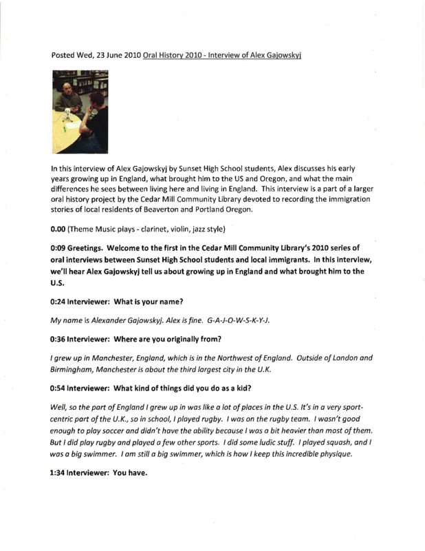 - An audio recording of an oral history of Alex Gajowskyj on his early years growing up in England, what brought him to the U.S. and Oregon, and the main differences he sees between living in the U.S. and living in England. Audio is a little fuzzy due to high recording levels.