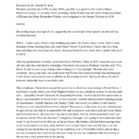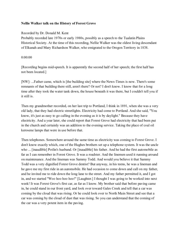 An audio recording of a talk by Nellie Walker on early Forest Grove, possibly given at a meeting of the Tualatin Plains Historical Society in the late 1970s or early 1980s. Nellie Walker was a descendant of Elkanah and Mary Richardson Walker, who emigrated to the Oregon Territory as missionaries in 1838. Nellie recalls memories of Forest Grove in the late 1800s passed down from Mary Richardson Walker, and her own memories of Forest Grove from the early 1900s. Topics include the Forest Grove Indian School, changing land use patterns, the arrival of electricity, telephones and automobiles, picnics at Naylor Grove and juvenile delinquency, including the burning of the local Chinese laundry. The recording begins approximately halfway through the talk; the first half is missing. This recording is accompanied by a transcript.