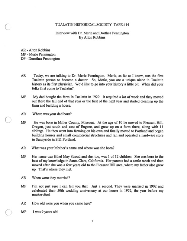 - Dr. Merle Pennington oral history interview