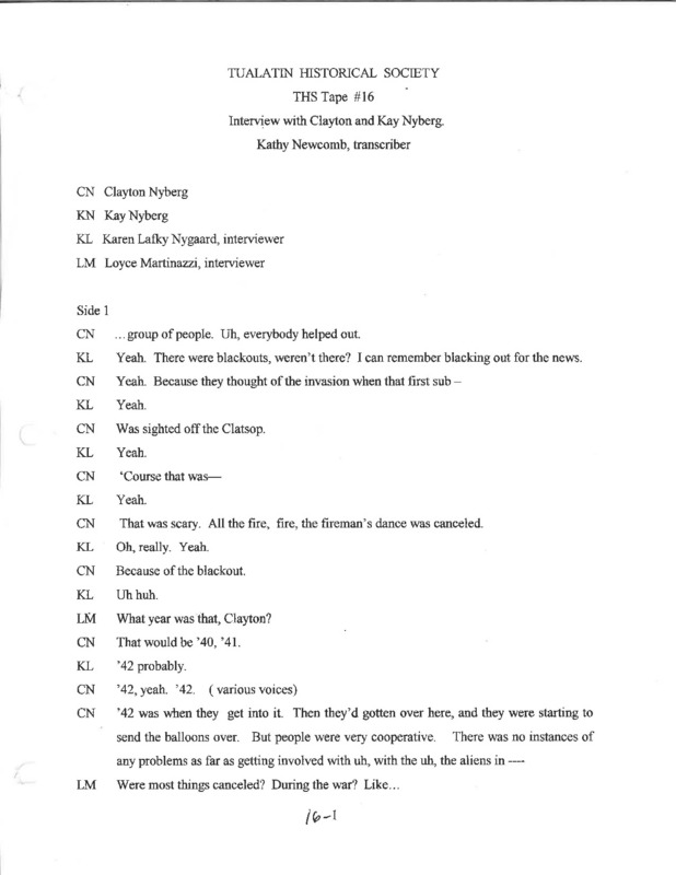 - An audio recording of an oral history of Clayton and Kay Nyberg. Part 3 of 3. There is a transcript of this interview.