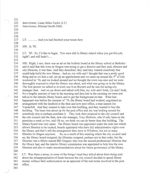 - A video recording of an oral history of Michael Smith on the Forest Grove Library in the 1970s and 1980s. There is a transcript of this interview.